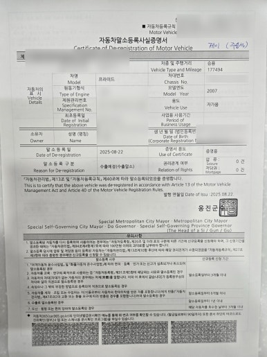 탁송기사님께서 늦은 오후 시간에 도착하여서 말소는 다음날 약속드렸습니다.