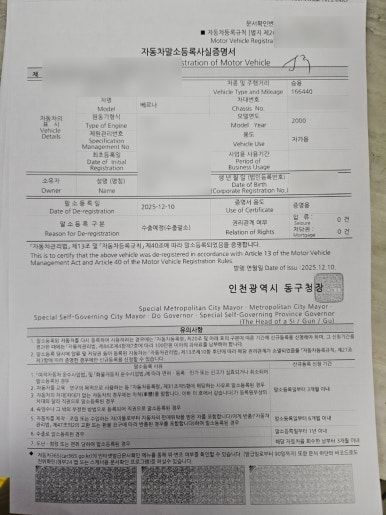 탁송기사님께서 안전하게 운행해 오셨고요. 도착하고 차량 정리 후 말소 바로 진행했습니다.