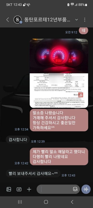 차주님께 말소증 인계 완료드렸고요. 이번 부품 수출 거래도 깔끔하게 마무리해 드렸네요.